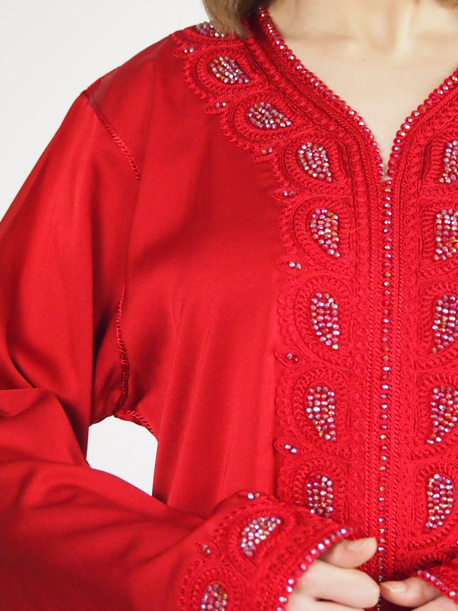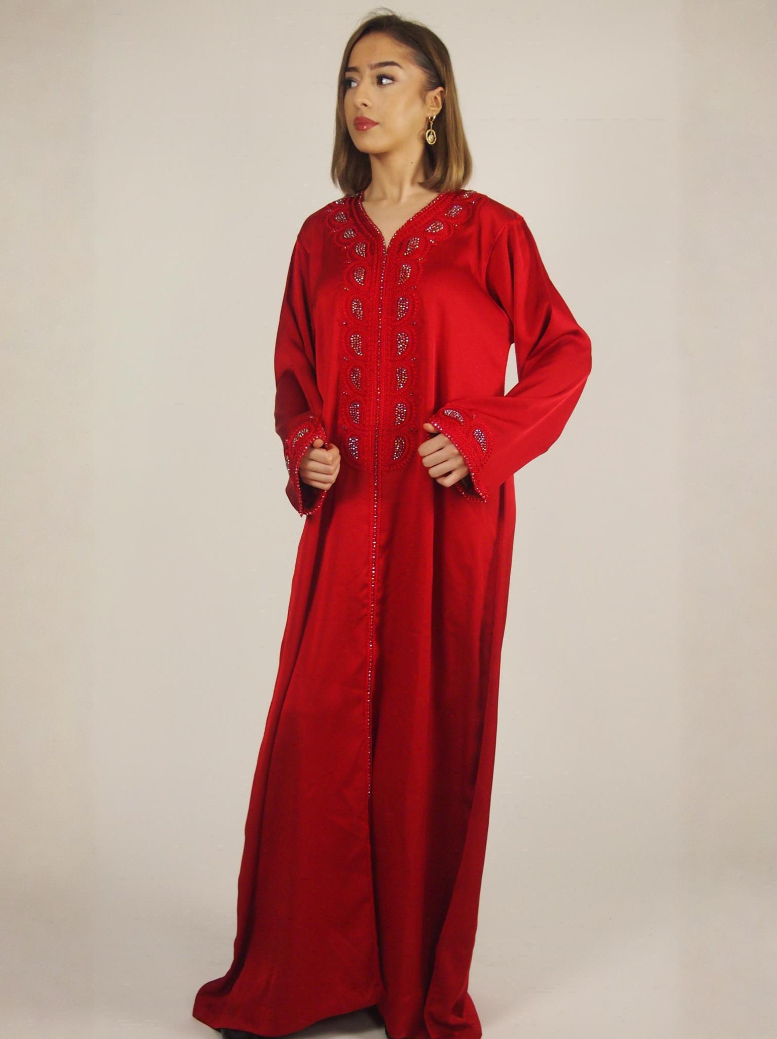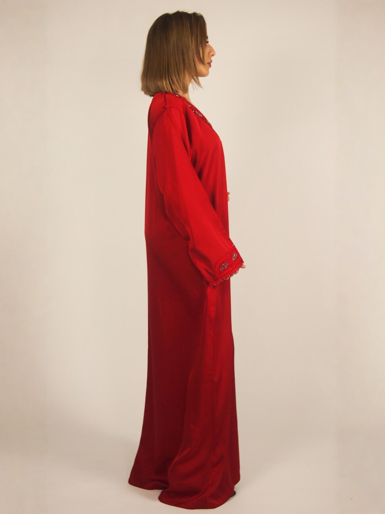 Gandoura Yâqût en Crêpe ornée de perles multicolores. Coupe longue et fluide qui allie confort au quotidien et raffinement pour l’Aïd. Coloris : Rouge, Gris.